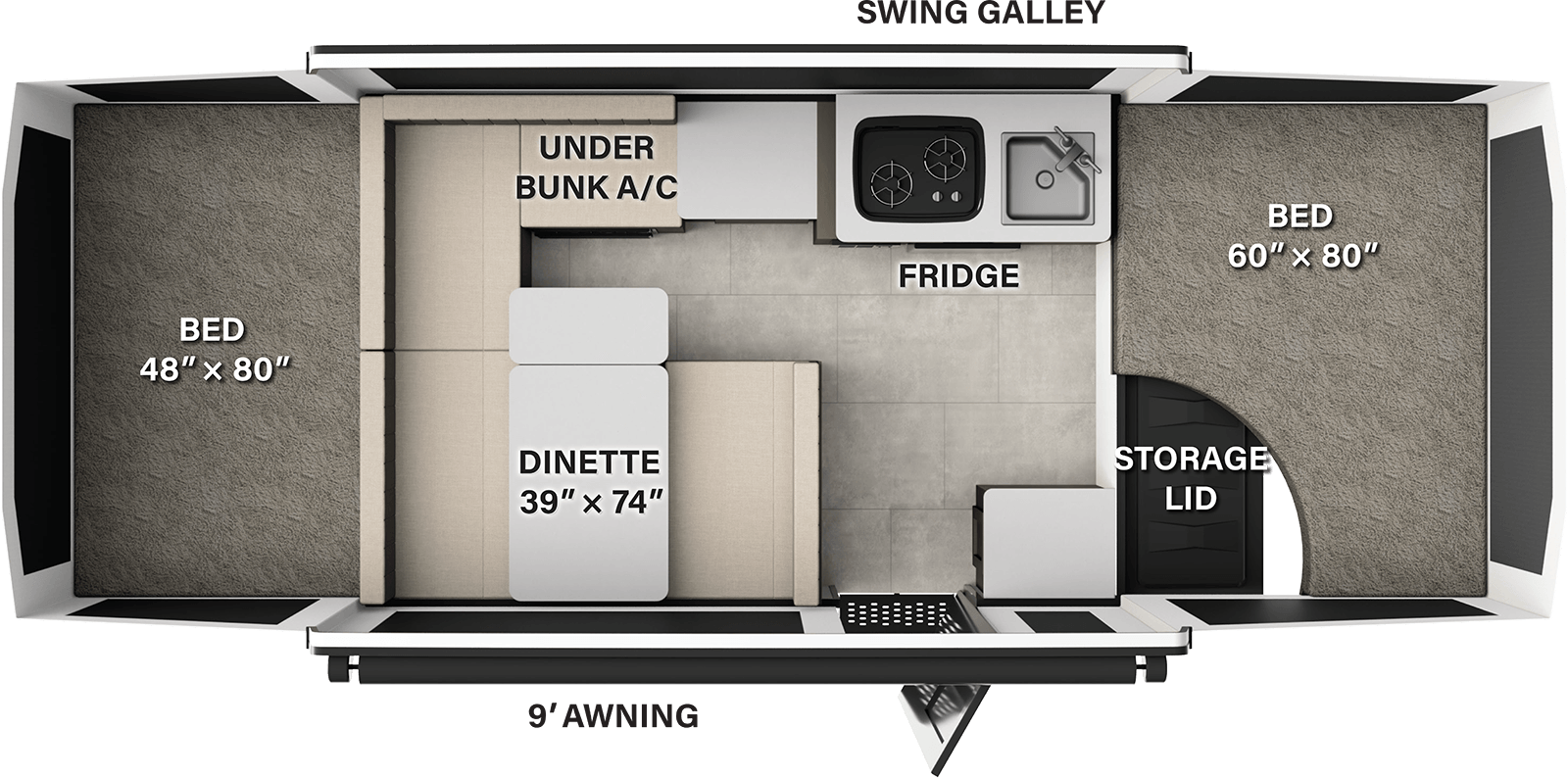 Similar in footprint to the 1920FT but featuring a different layout, the 1930FT delivers comfort for families on the move. It includes wood-plank-style flooring, full privacy curtains, the Create-A-Breeze fan, and the power roof lift system that makes setup simple. For campers wanting the convenience of a pop-up with home-like warmth, the 1930FT is a smart choice.
