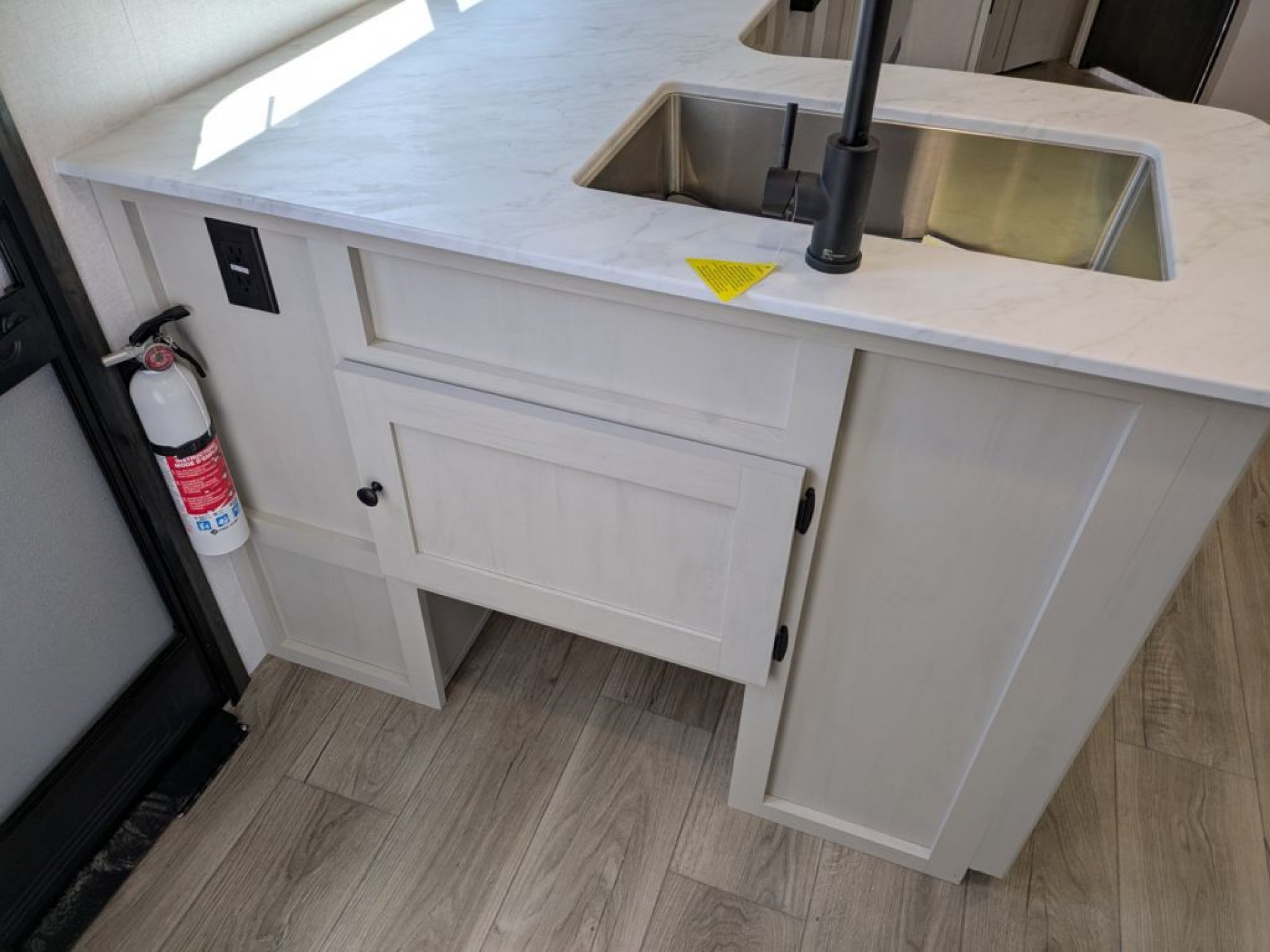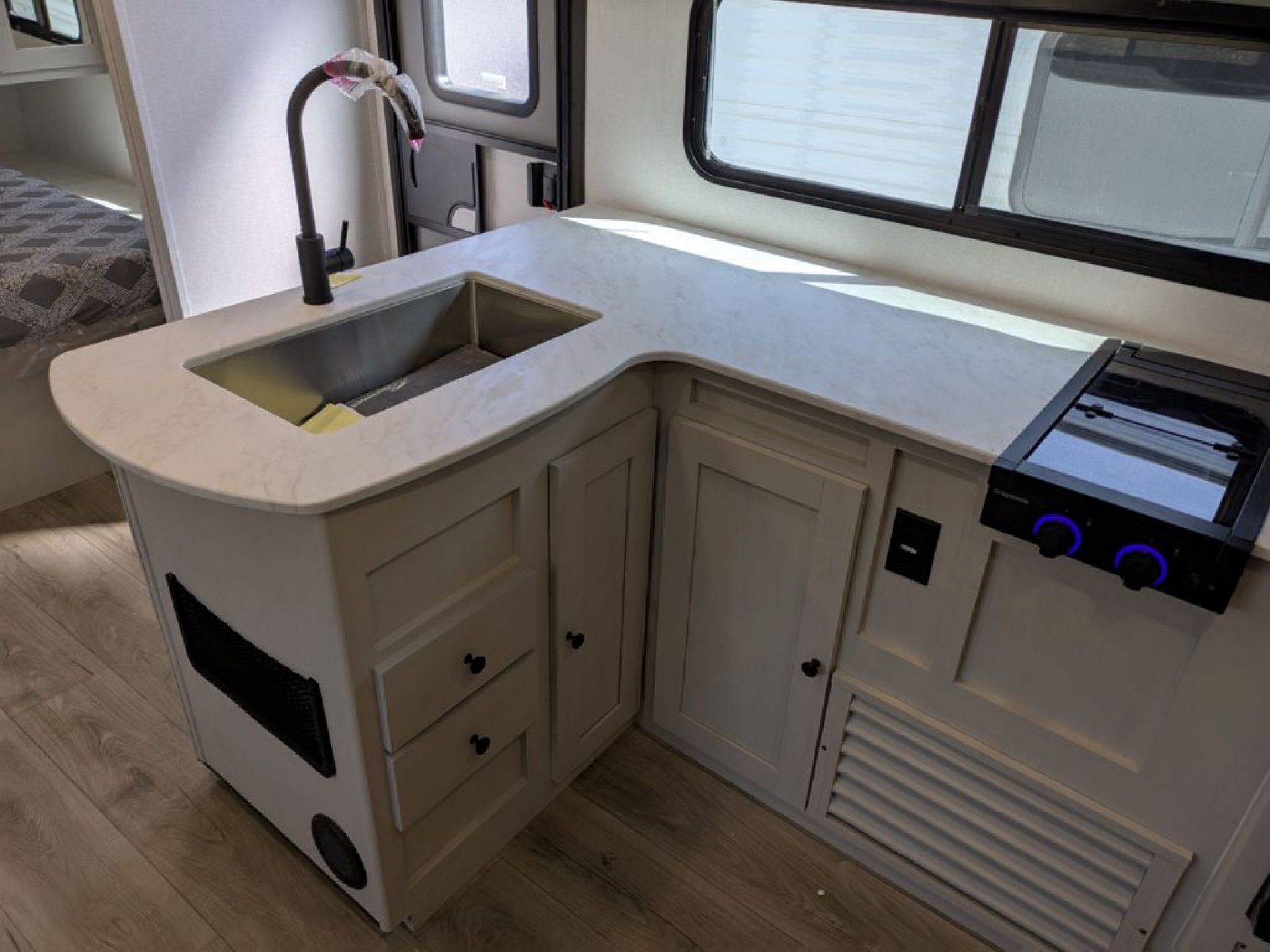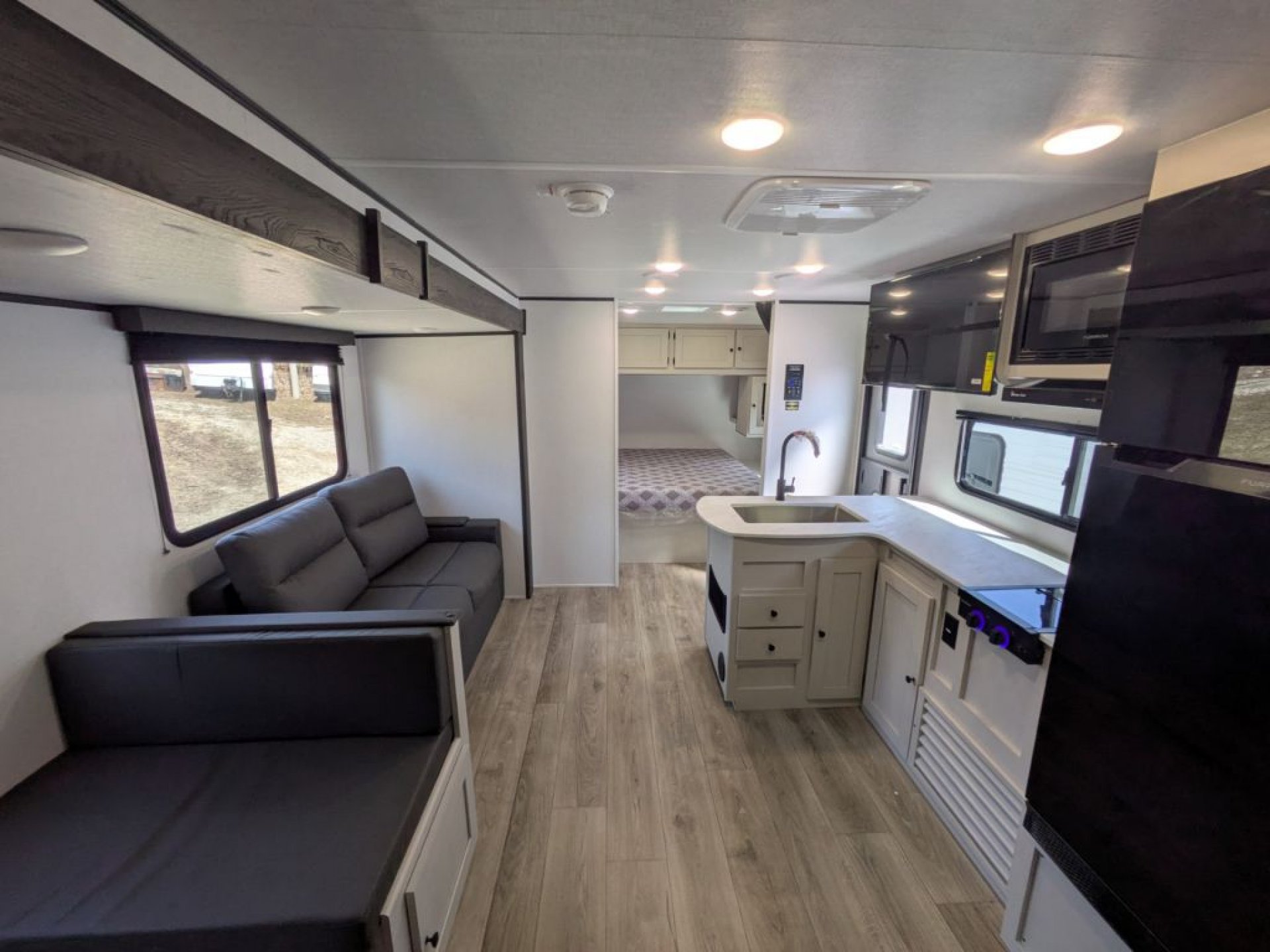 Farmhouse-Inspired Kitchen – Seamless Thermofoil countertops, deep basin sink, and 10 cu. ft. 12V fridge.