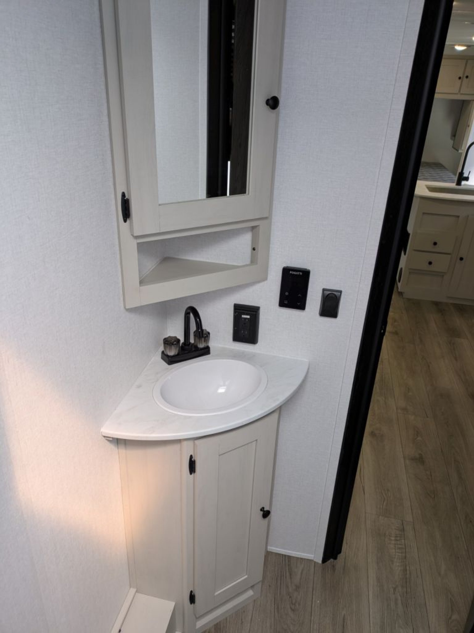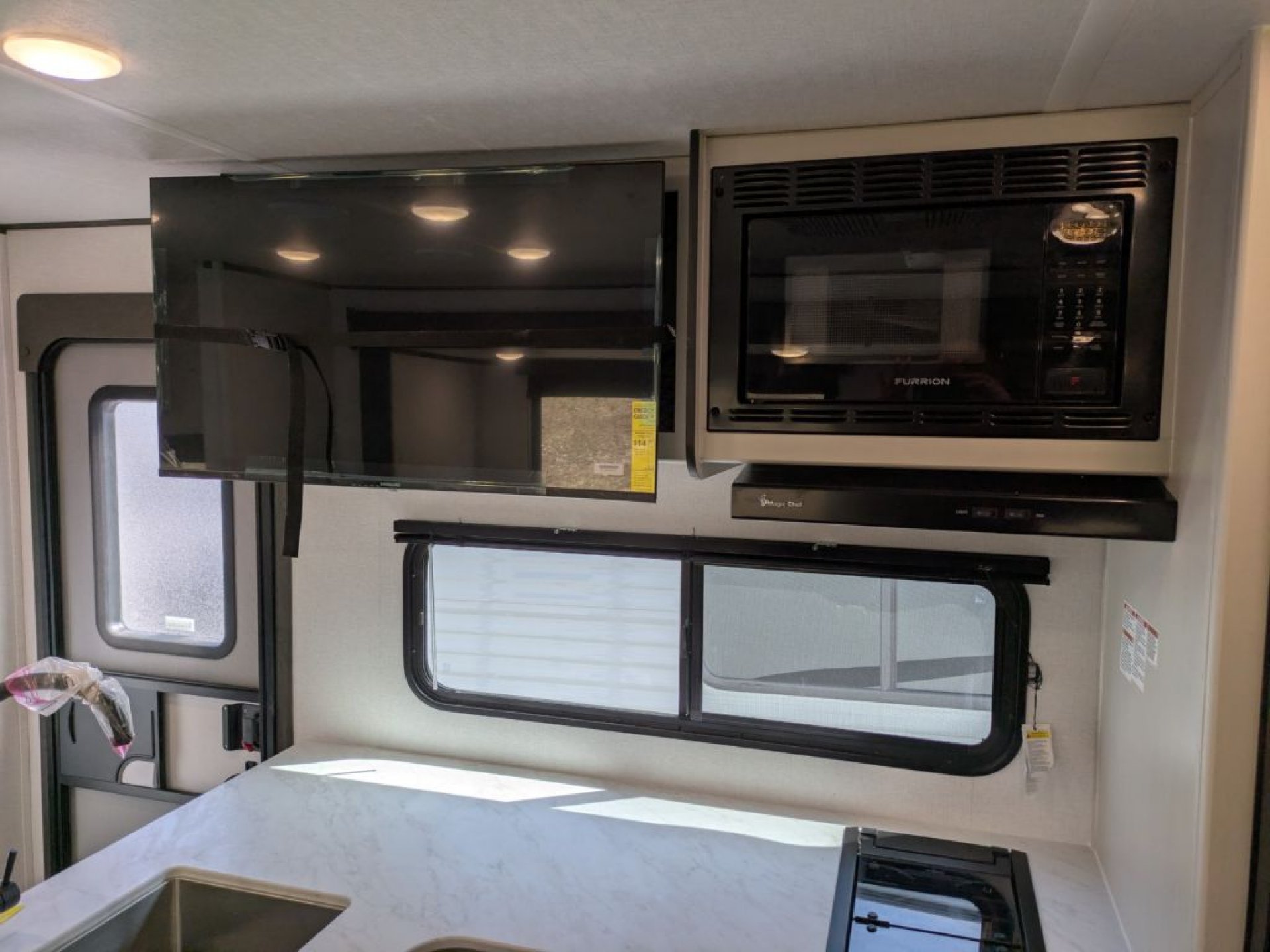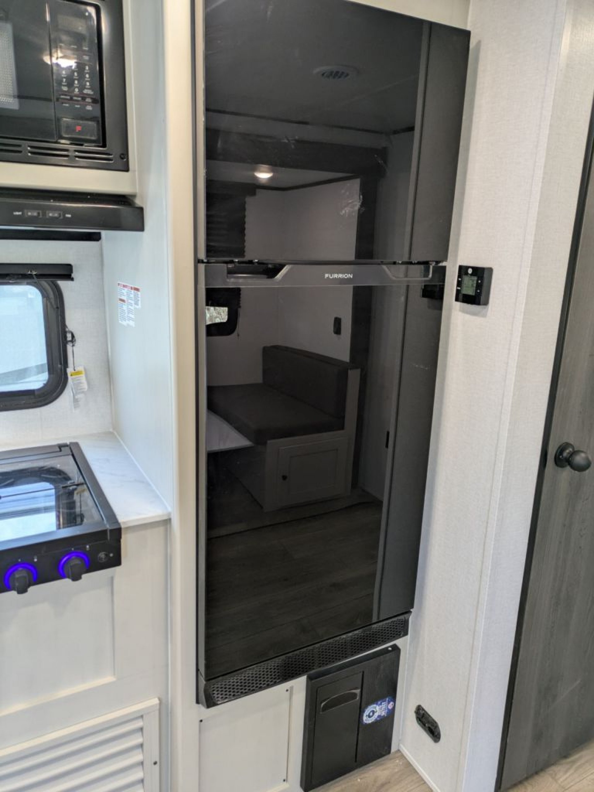 Farmhouse-Inspired Kitchen – Seamless Thermofoil countertops, deep basin sink, and 10 cu. ft. 12V fridge.