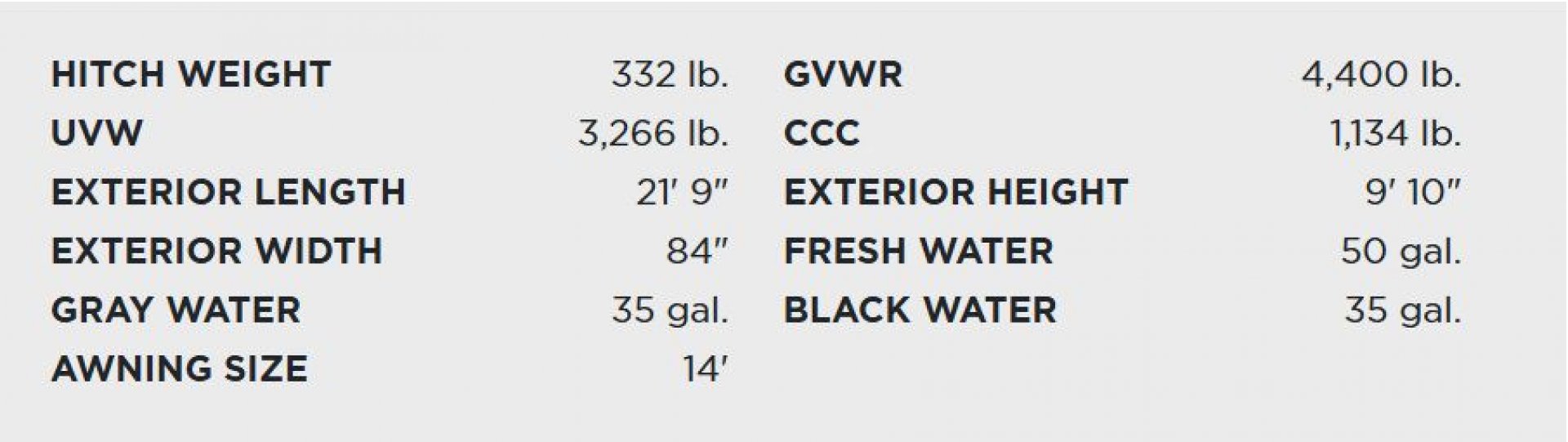 | Dry Weight | 3266 lbs. | Grey Water | 35 gals. |