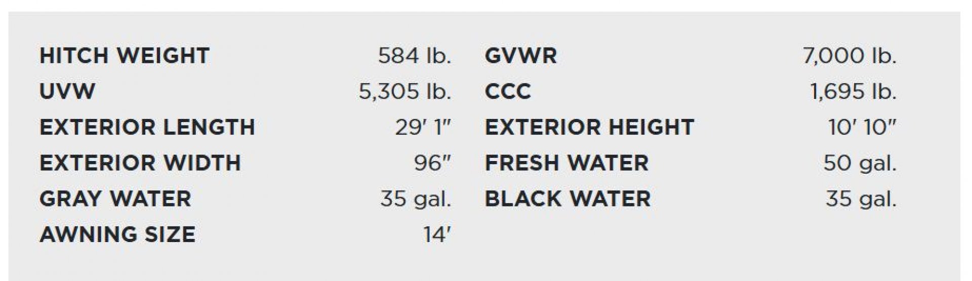 | Dry Weight | 5305 lbs. | Grey Water | N/A |
