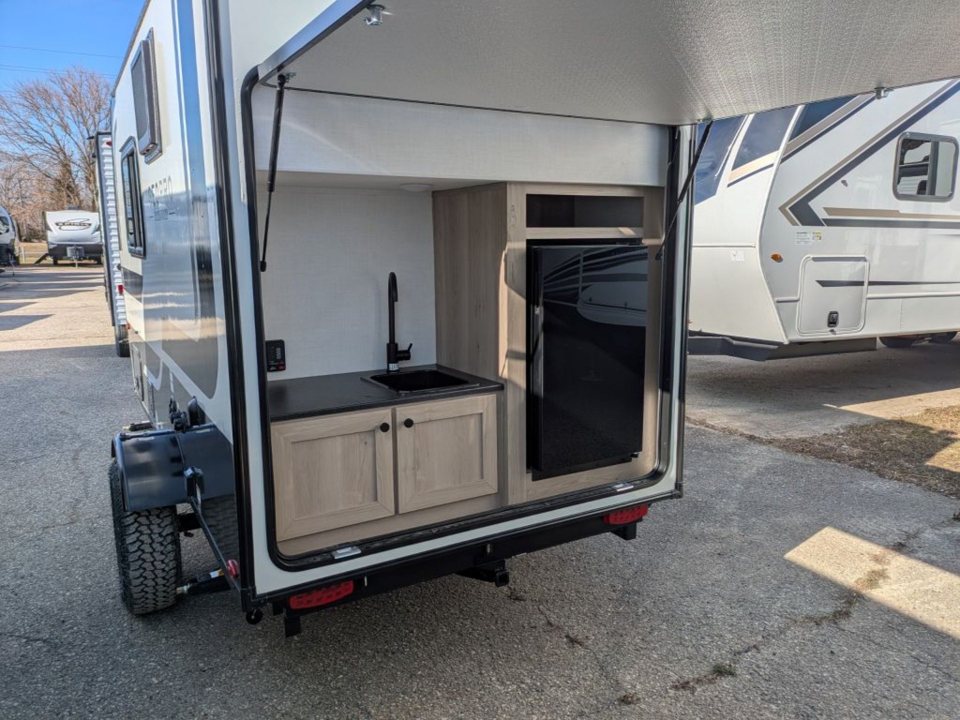 The kitchen space is thoughtfully equipped for simple meal preparation with a two-burner cooktop, recessed stainless steel sink, microwave and a refrigerator that keeps your food fresh throughout your journey. A convenient countertop and storage cabinets give you room to prep and stow essentials, making cooking in the campsite just as enjoyable as cooking at home.