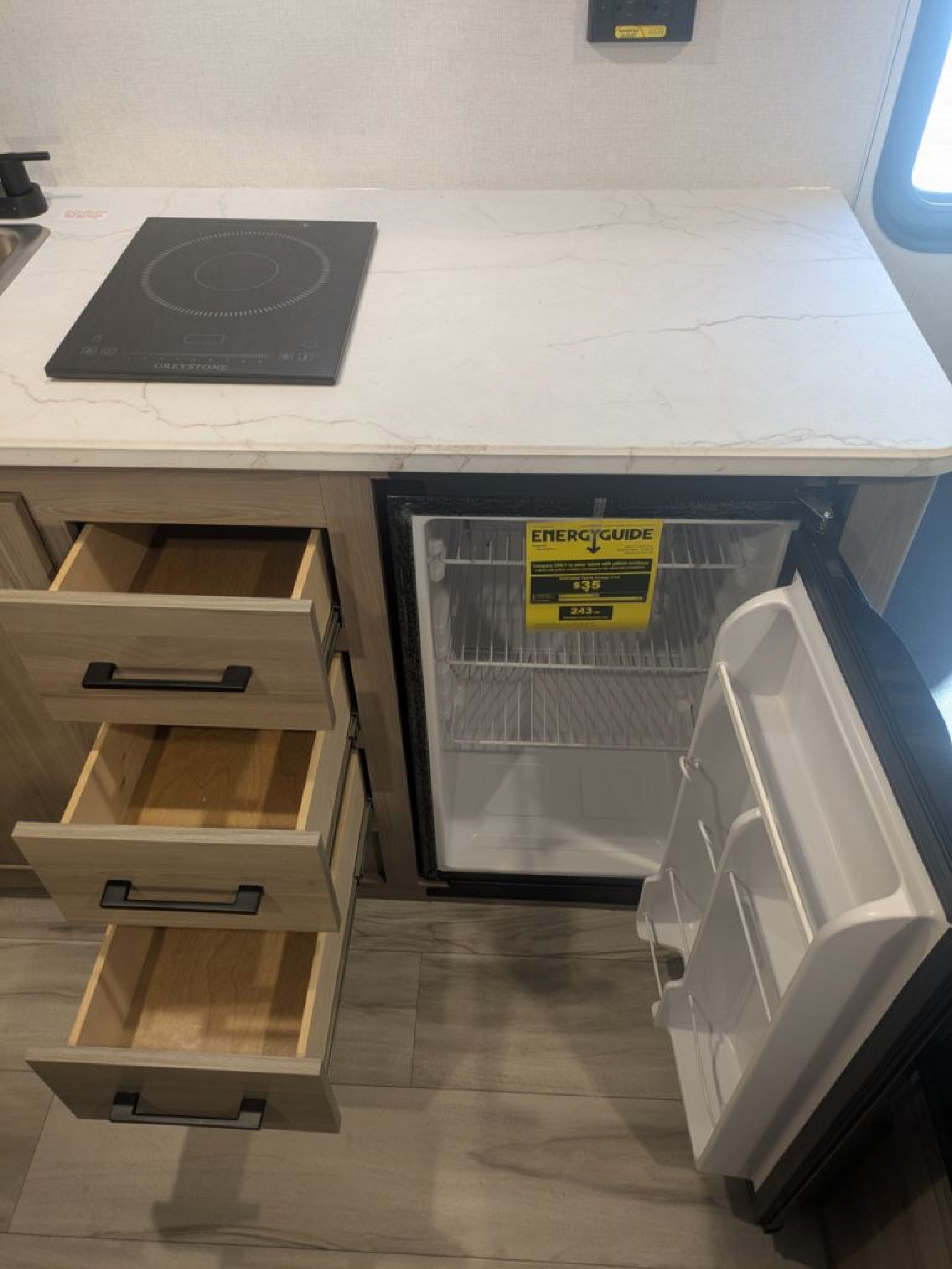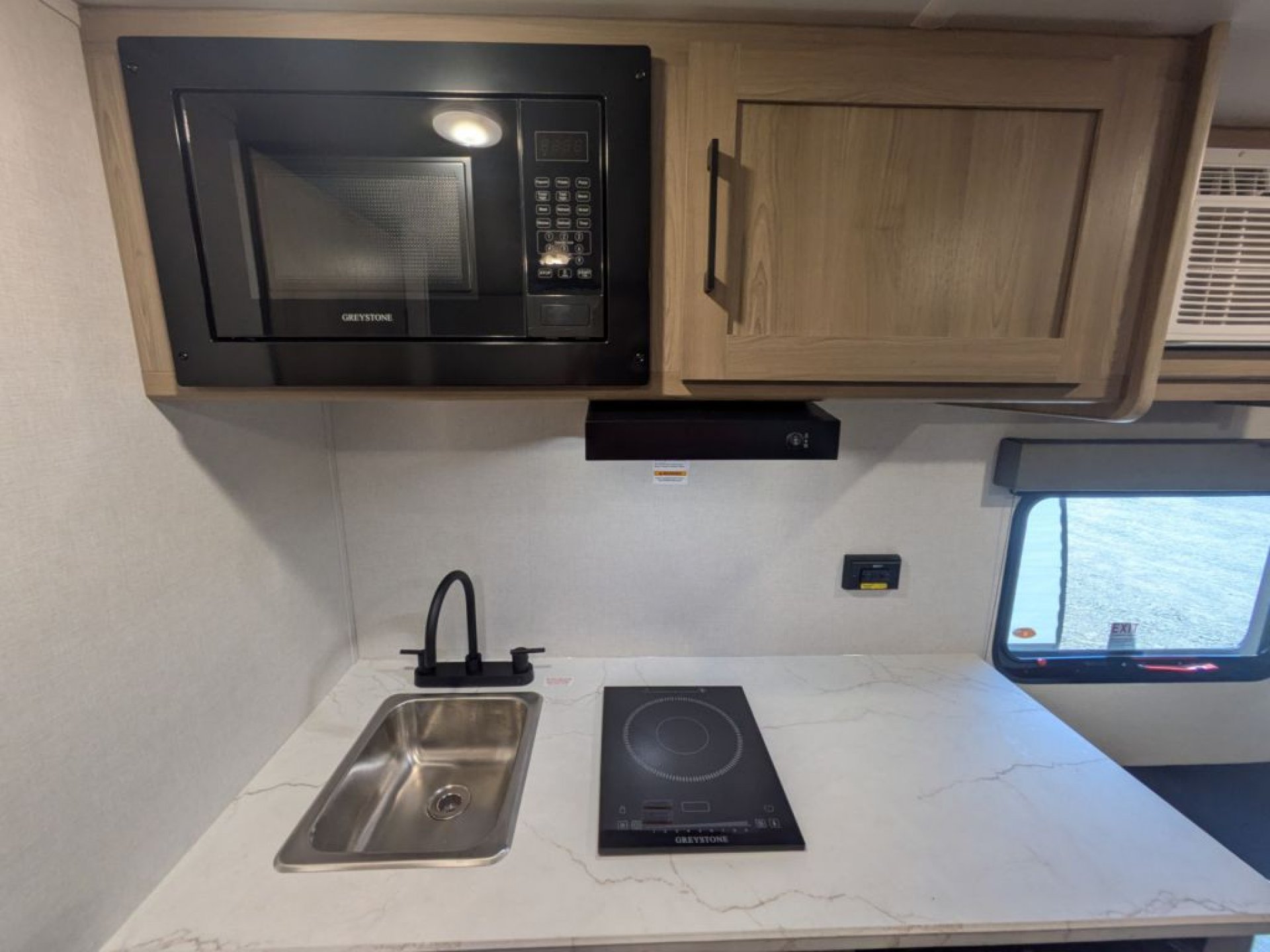 Functional Kitchenette: Equipped with a single-burner induction cooktop, microwave, and a 3.3 cu ft refrigerator, allowing you to prepare and store meals with ease.