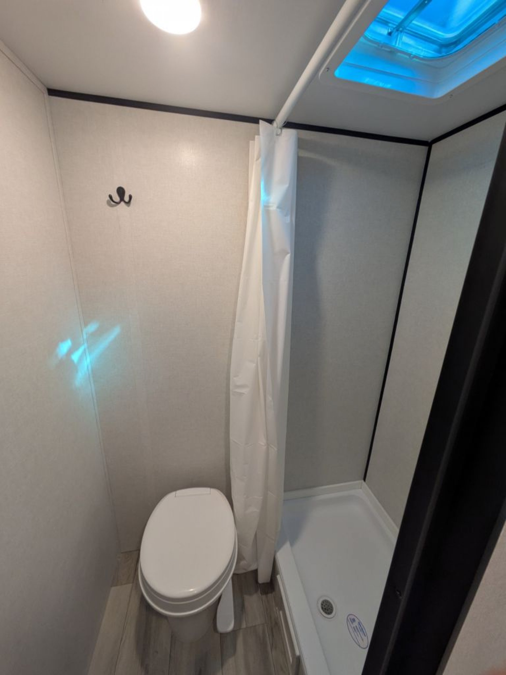 Convenient Bathroom Facilities: Features a compact bathroom with a plastic toilet and shower, providing the essentials for your hygiene needs on the road. ?