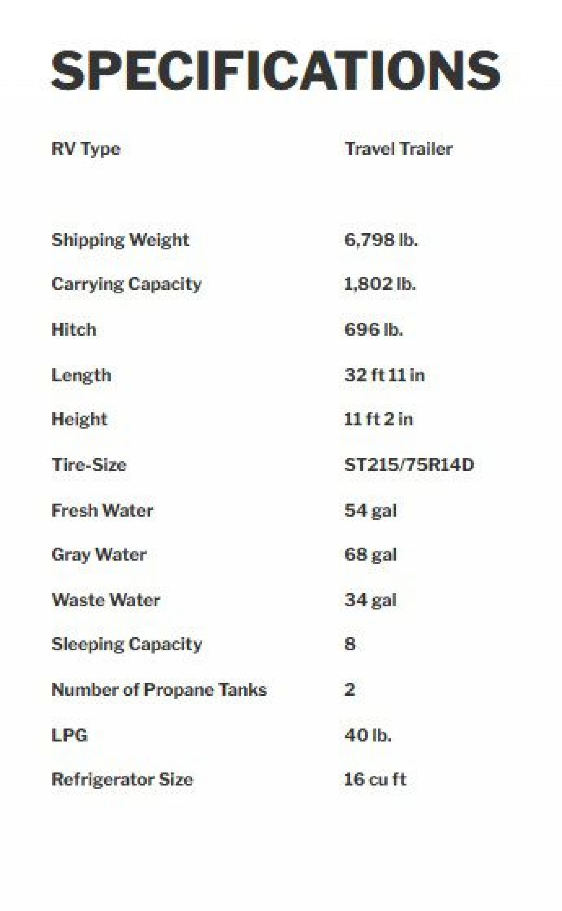 | Dry Weight | 6798 lbs. | Grey Water | 68 gals. |