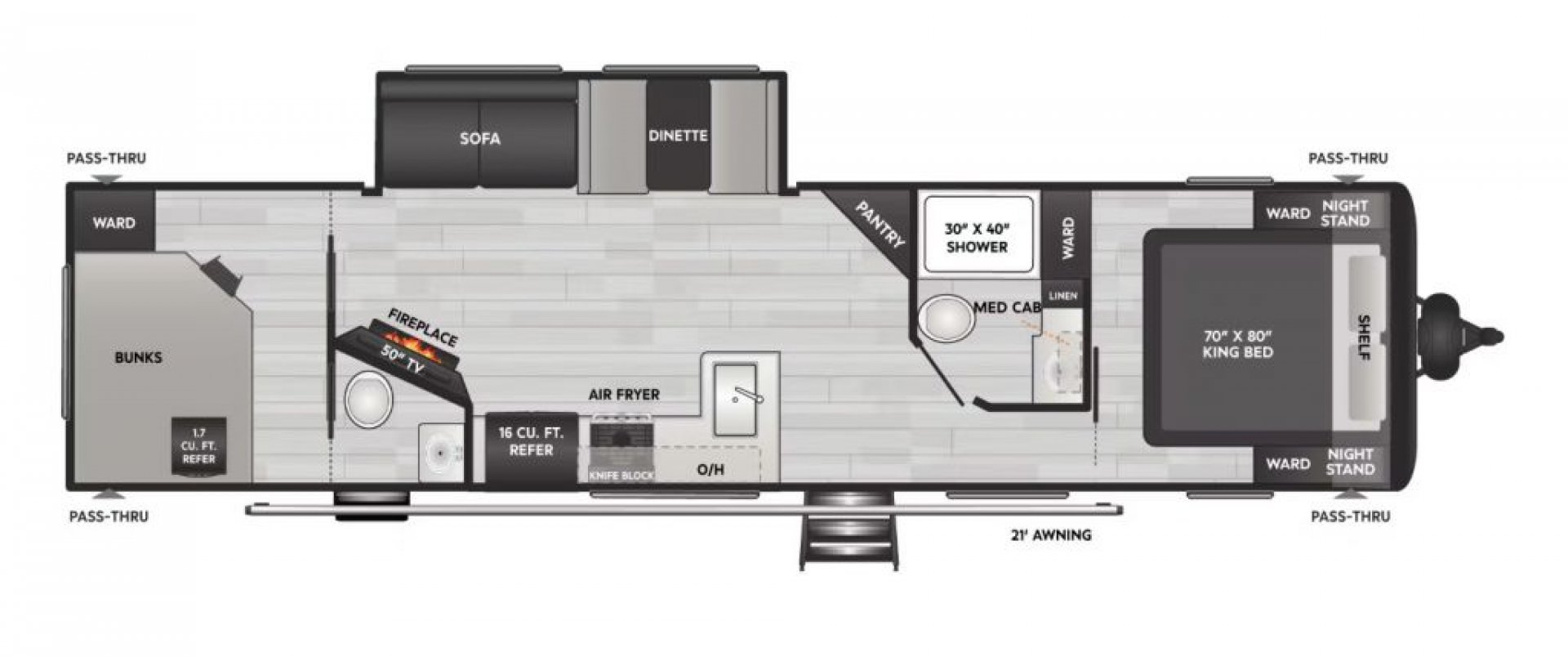 Cooking and meal prep are a pleasure in the well-equipped kitchen. With a three-burner cooktop, oven and a sizeable refrigerator, you’ll have all the tools you need to prepare everything from simple breakfasts to hearty dinners. The large pantry and cabinets help keep your gear organized and easy to access, while the dining area is perfectly positioned for family meals and evening conversations.