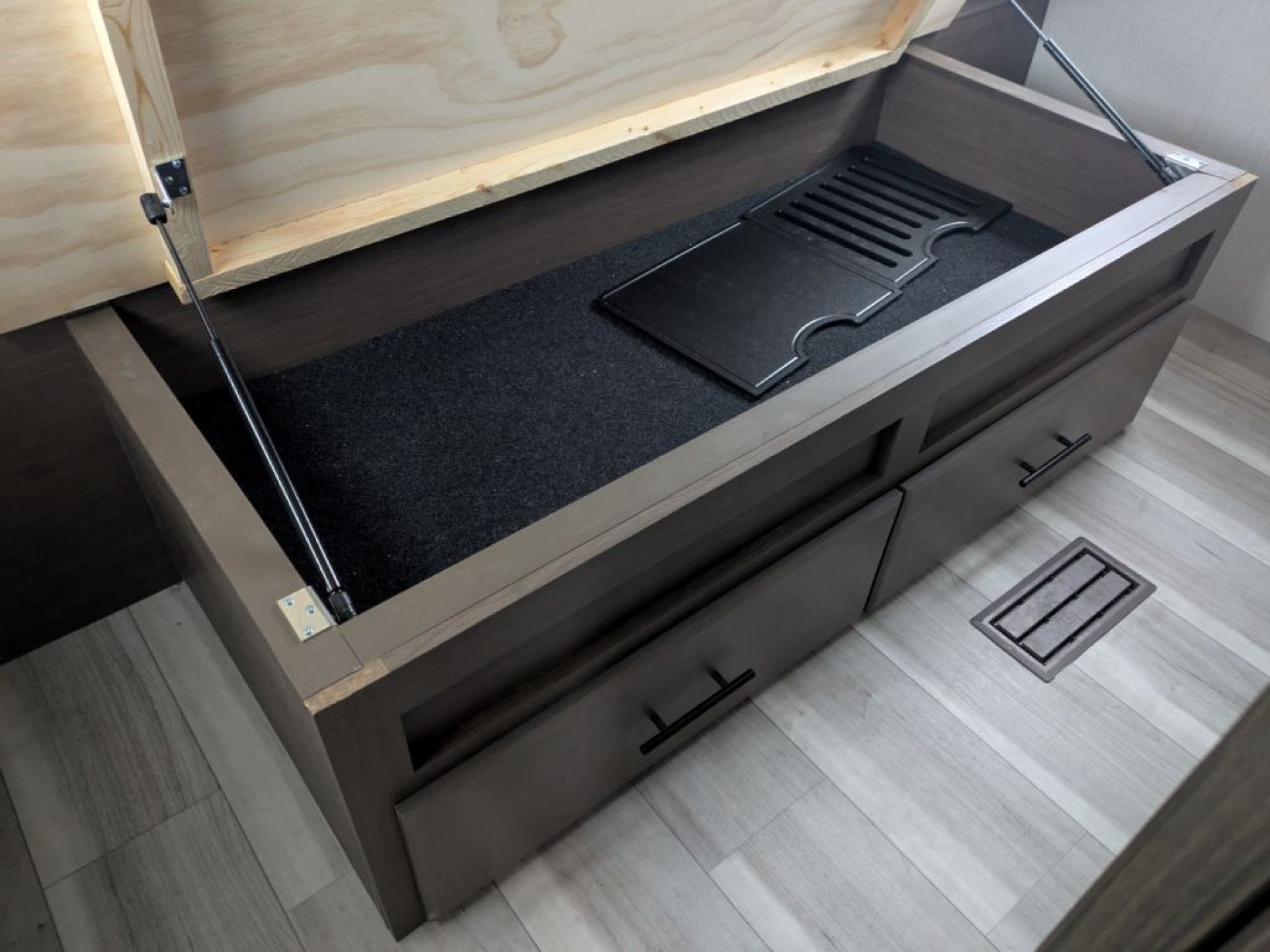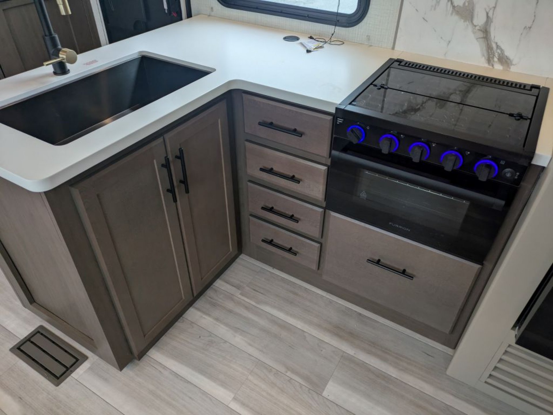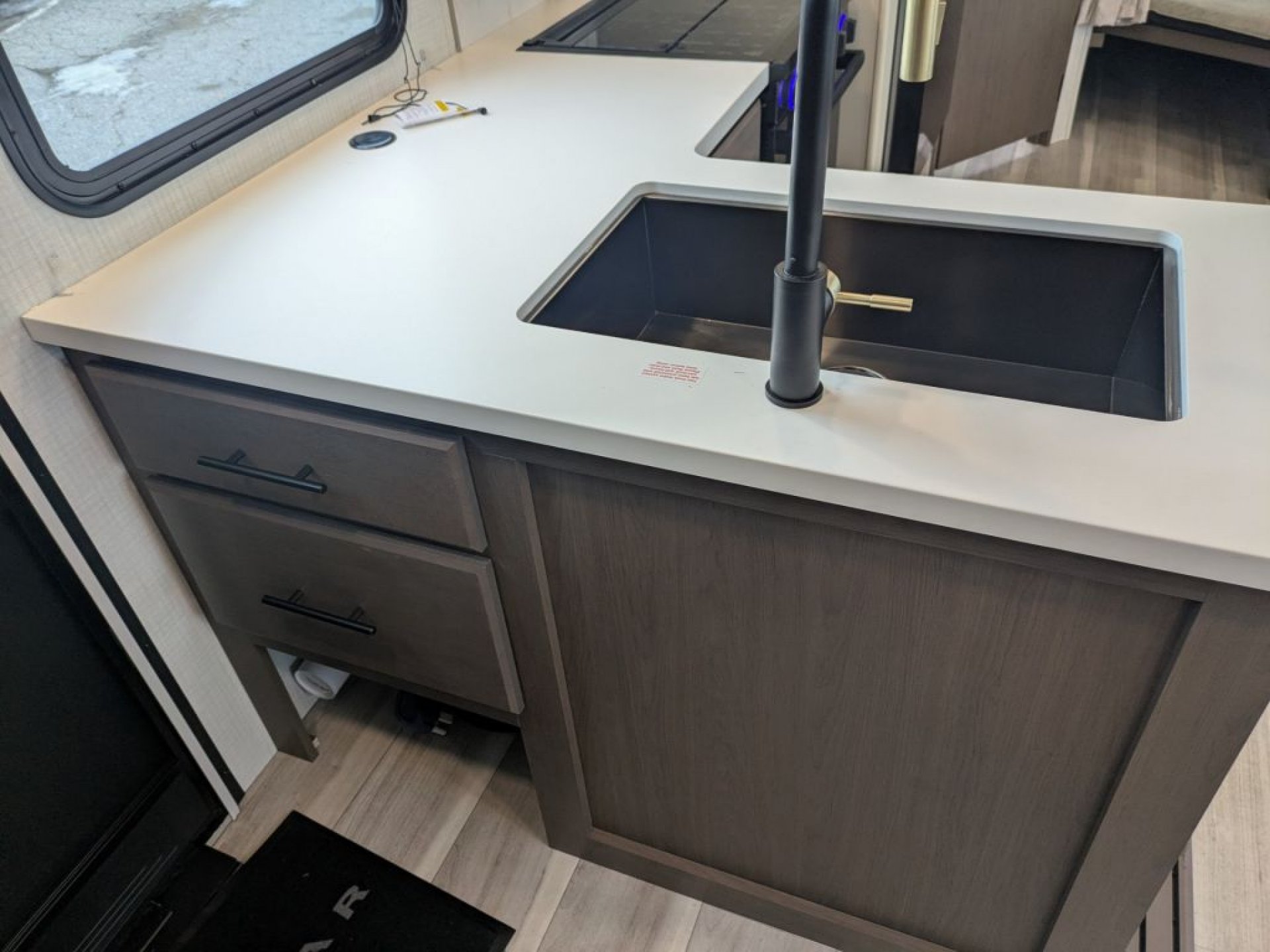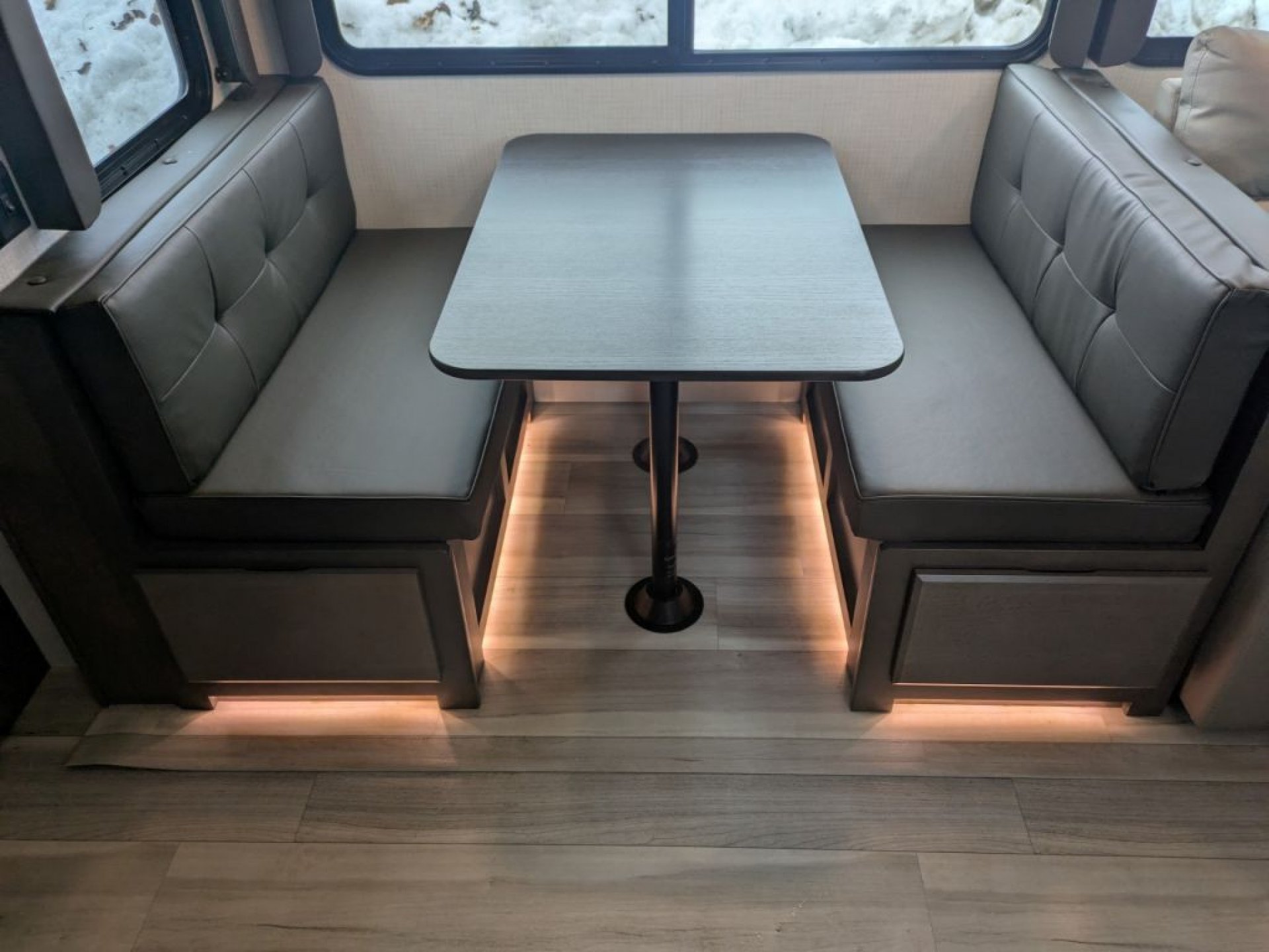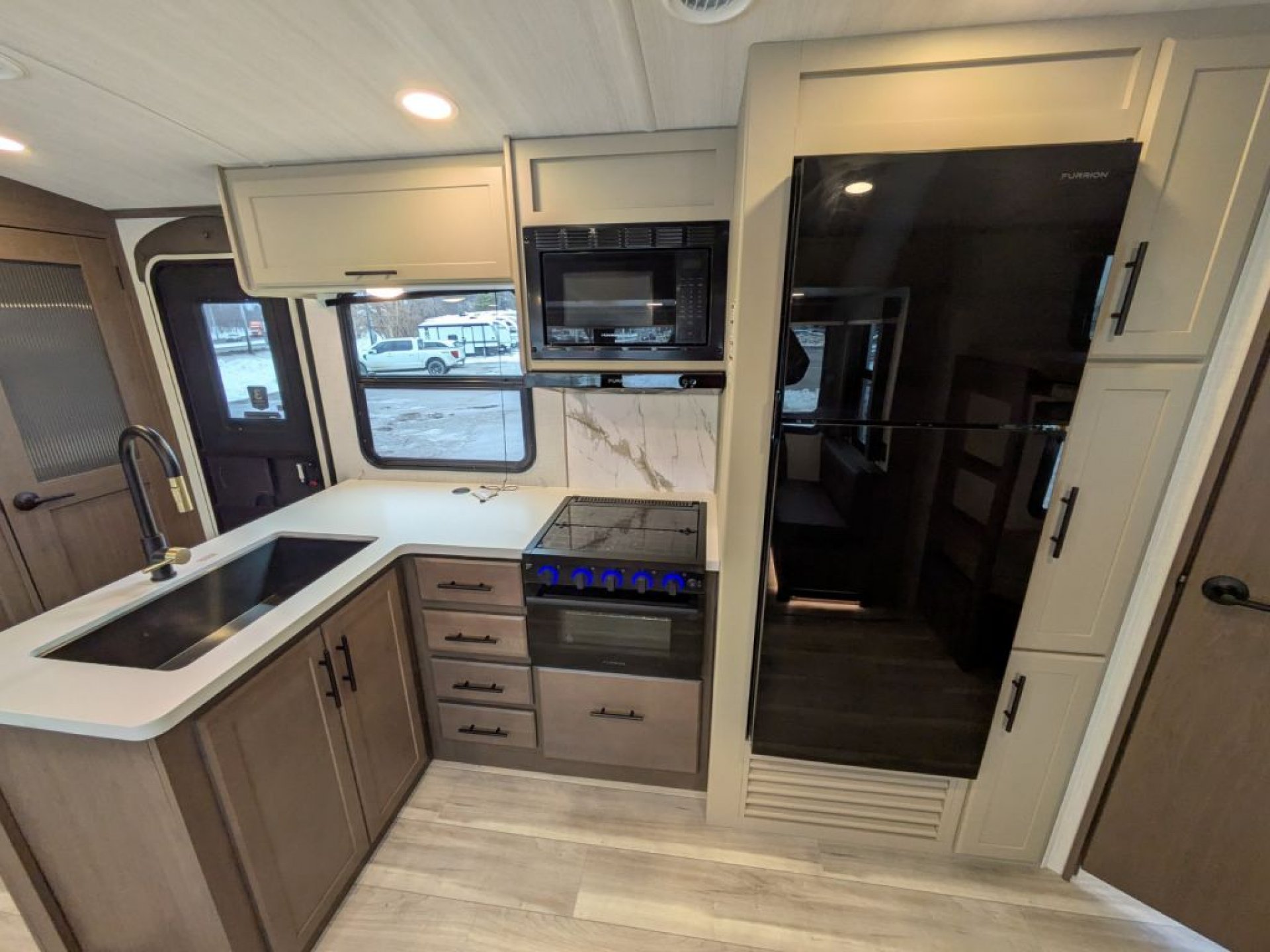 The interior features modern finishes and thoughtful touches designed for real camp life. A spacious booth dinette and comfortable seating make meal times and game nights comfortable, and the entertainment center provides a place to enjoy movies together during rainy evenings. The kitchen comes equipped with a well-appointed cooktop, ample countertops and a sizeable 12 volt refrigerator that keeps food fresh throughout your trip.