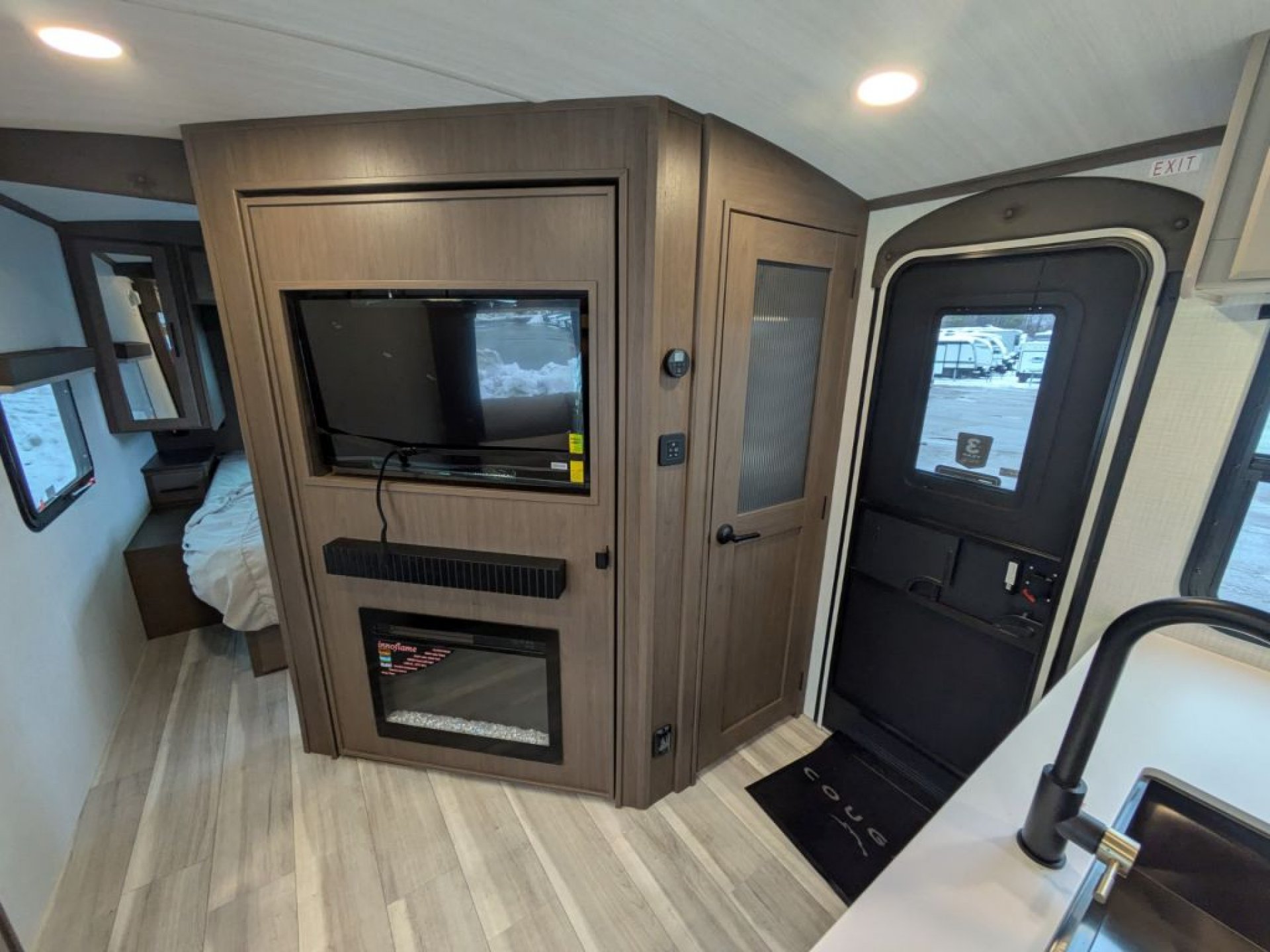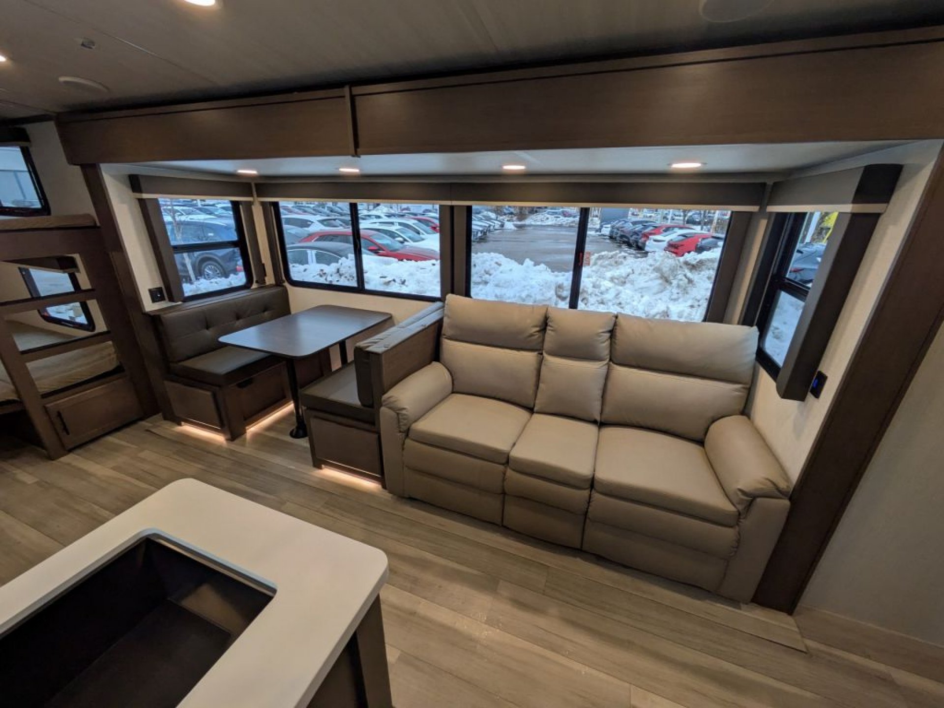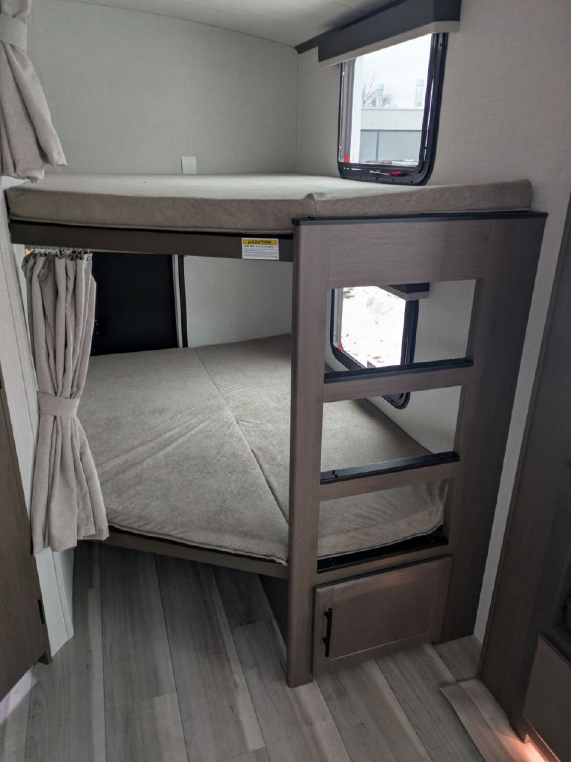 Step inside and you’ll immediately appreciate the smart layout that makes the most of every square foot. A private front bedroom with a king-size bed offers a cozy retreat at the end of the day, while the rear bunkhouse gives kids or guests their own space to sleep and relax. The large slide-out expands the main living area, creating an open feel where everyone can gather, dine or unwind after an adventure.