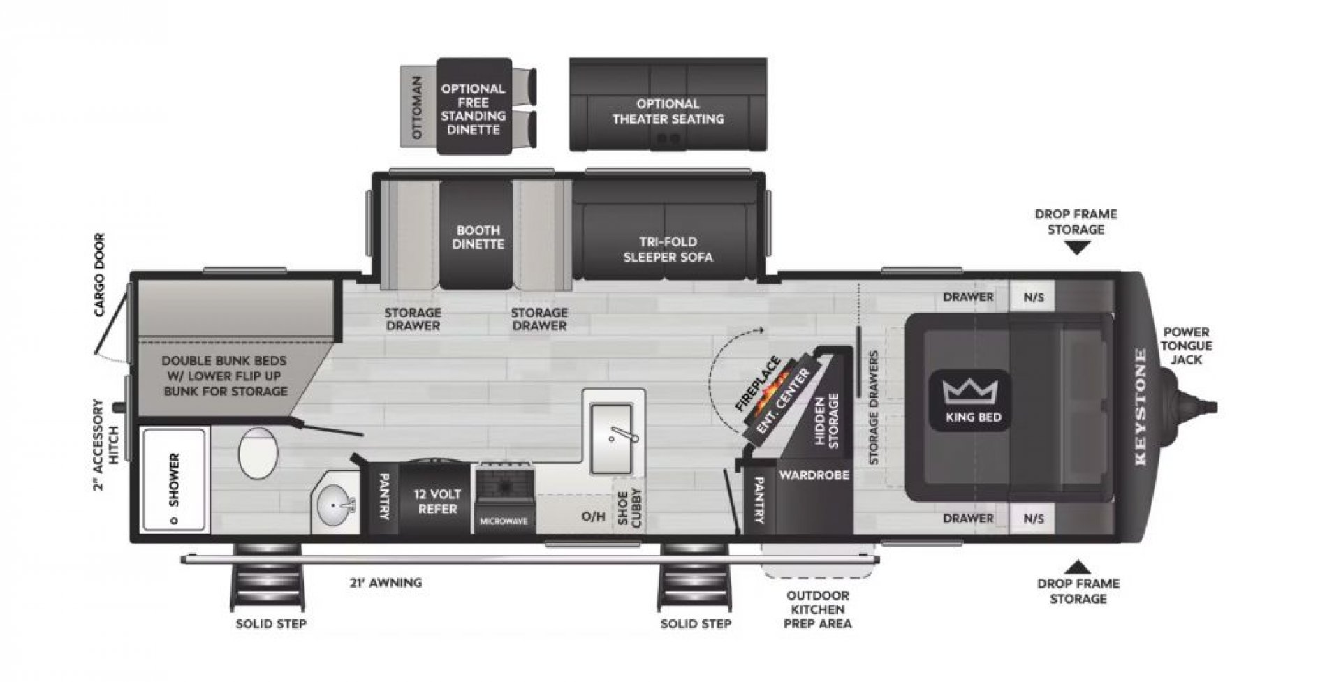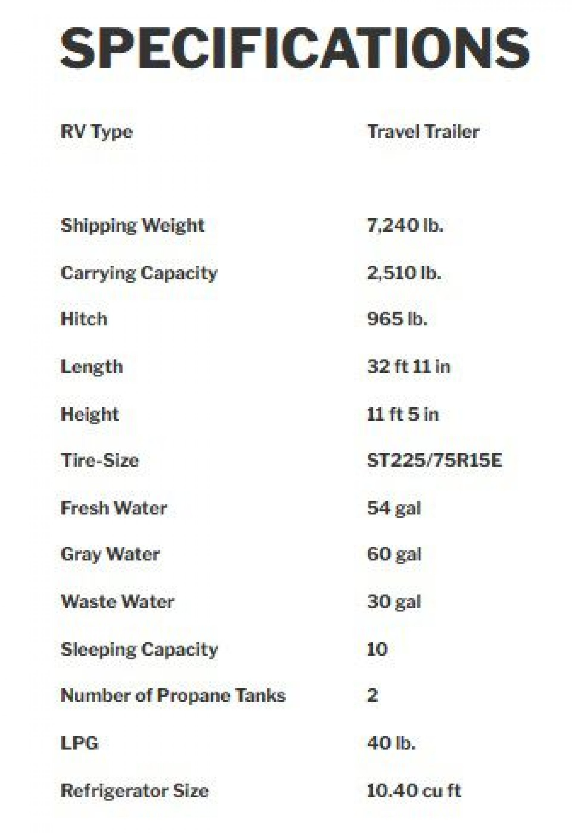 | Dry Weight | 7468 lbs. | Grey Water | 60 gals. |