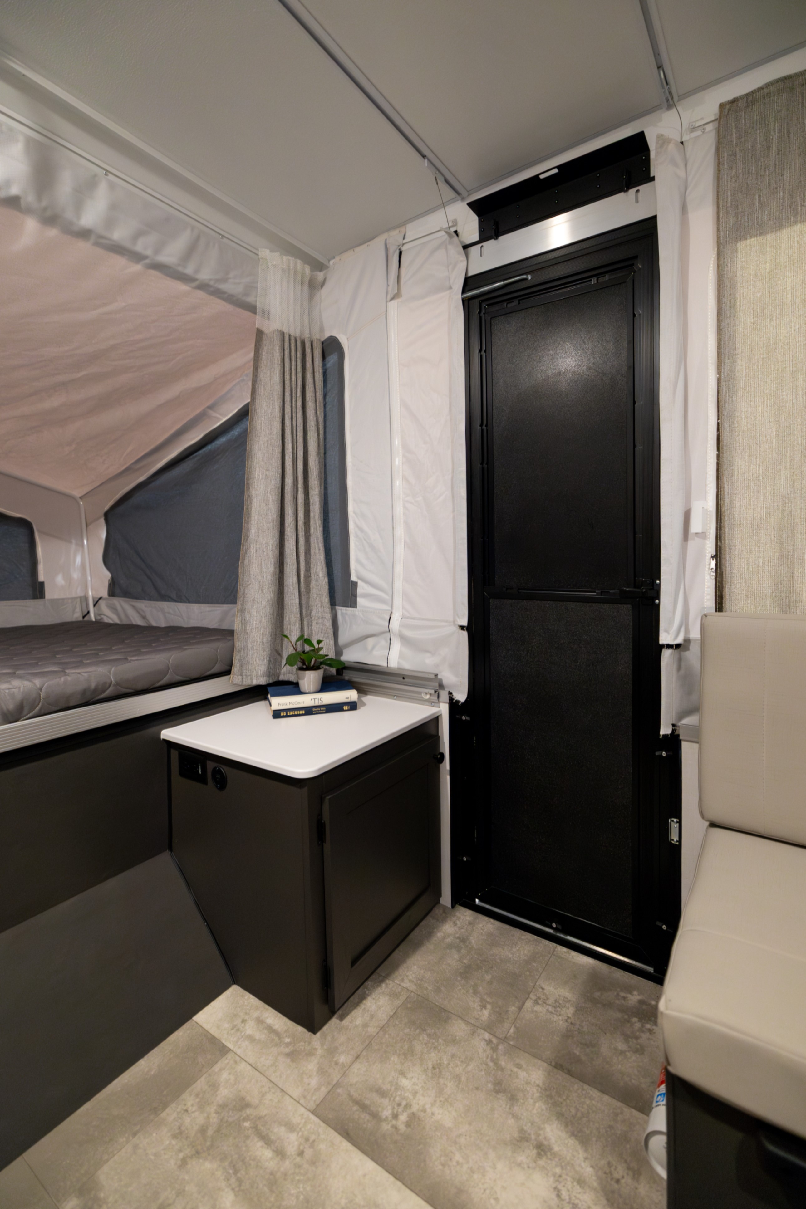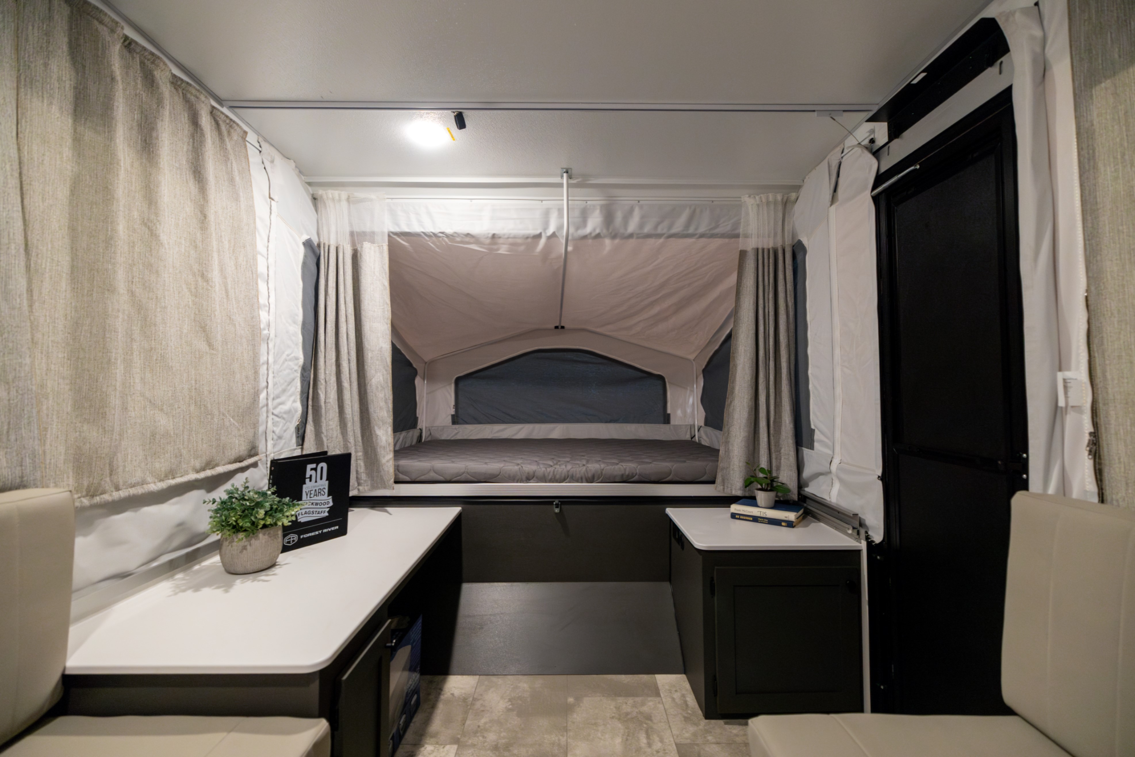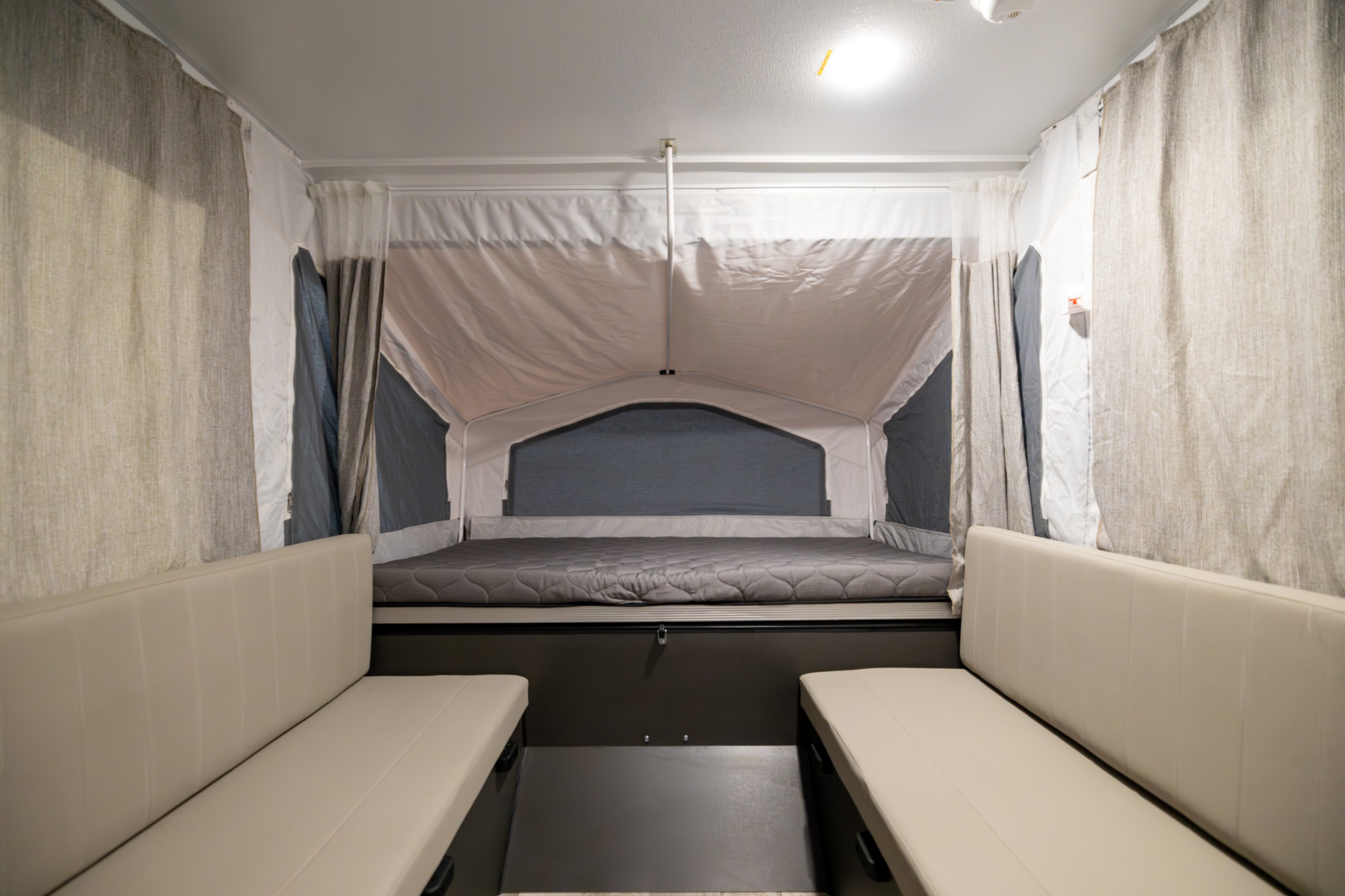 Inside every Rockwood Tent model, you’ll find wide-body beds that measure 80 inches long and plenty of interior space thanks to the 85-inch body width. Thick four-inch cushions provide a soft, supportive sleeping surface, while the open design makes the trailer feel spacious and bright. The power roof lift and stabilizer jacks make setup effortless, even for first-time campers.