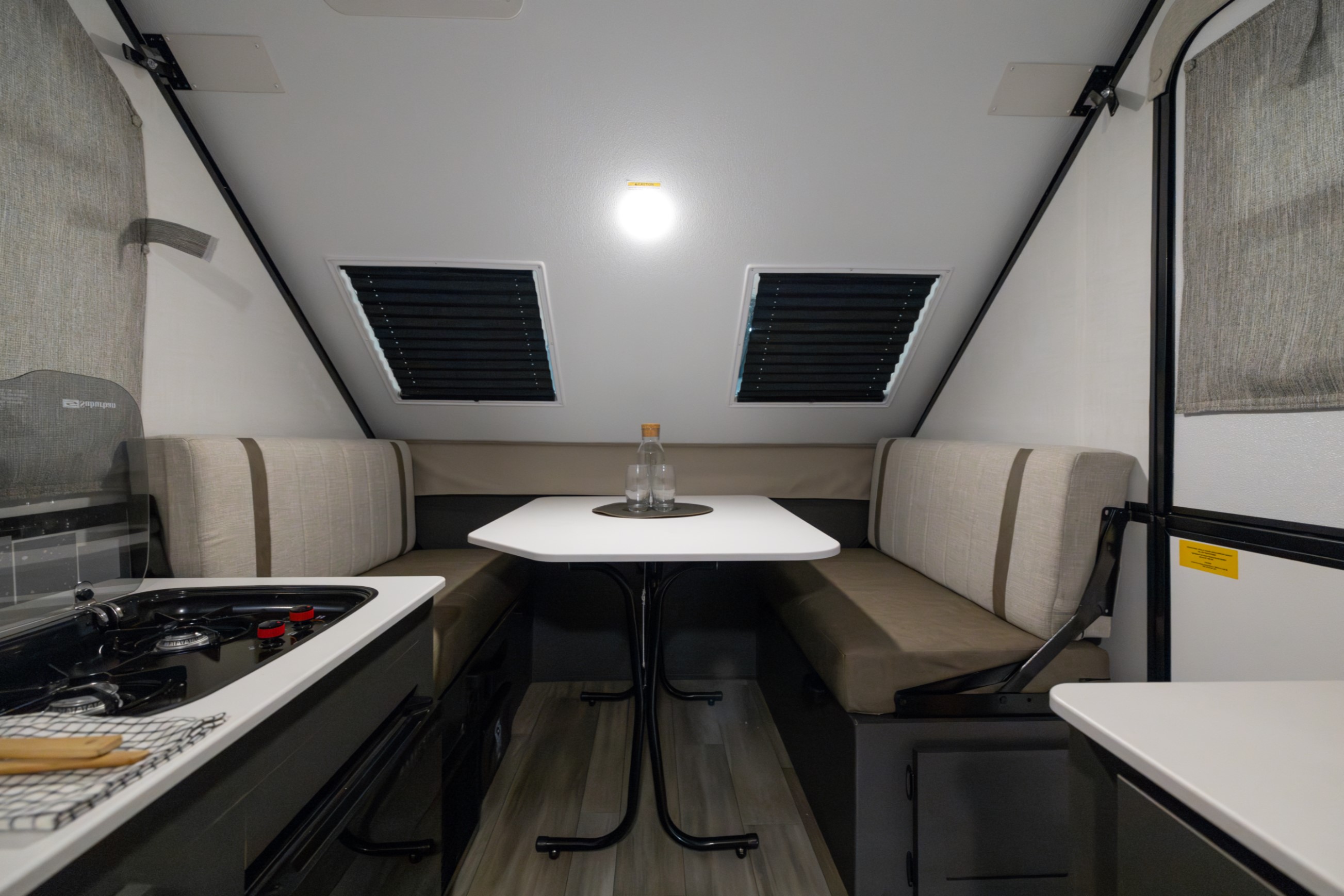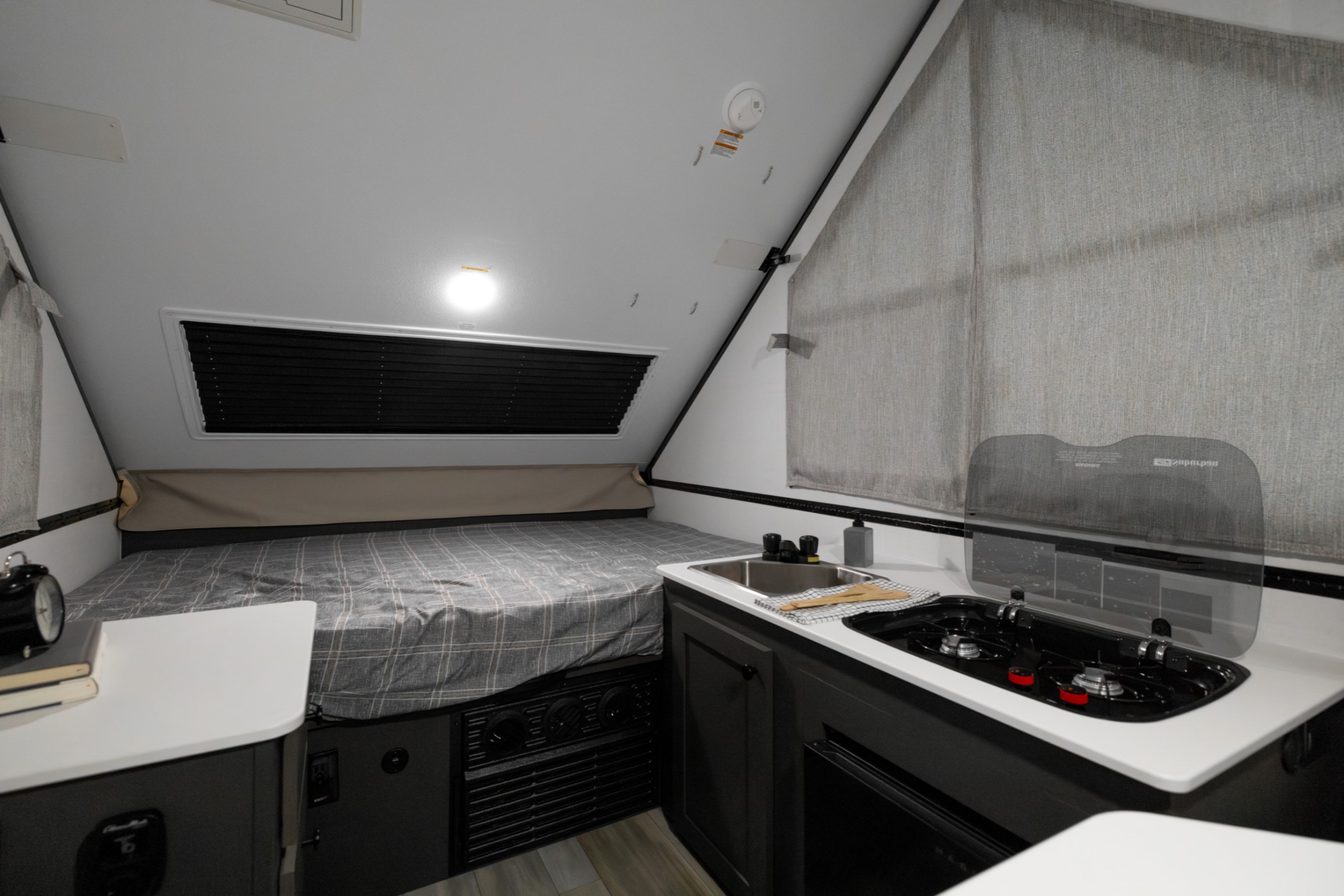 The living area is equipped with efficient LED lighting throughout, providing bright illumination without draining power. Many models come with a 12-volt refrigerator and a roof-mounted solar panel to extend your time off-grid. You’ll also find a 12-volt water pump that provides a steady flow of fresh water, and an indoor range with a glass cover where applicable, making it easy to cook inside even on rainy days.