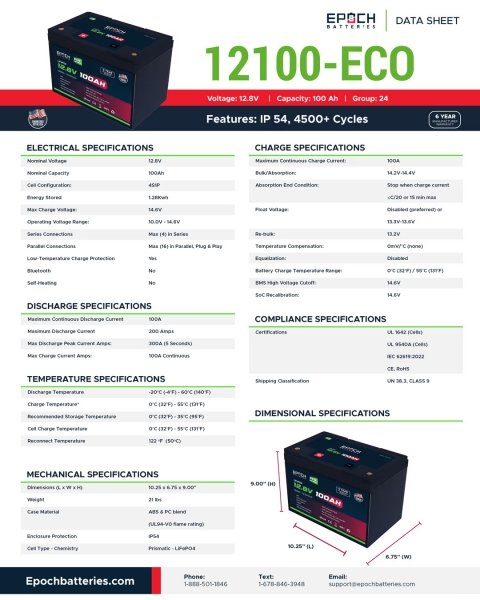 LiFePO4 Chemistry - Deep Cycle Battery Group 24: L10.25" x W6.75" x H9.00" Low-Temperature cut-off (Charge Protection) Built-in Smart Battery Management System (BMS) Advanced BMS system with 20+ safety features built in Over charge and over discharge protection Over current and short circuit protection High & low temperature disconnects Max (4) in Series up to 48V Max (16) in Parallel up to 20.48 kWh 4,500+ Cycle life & Maintenance-free 6 Year Manufacturer Warranty